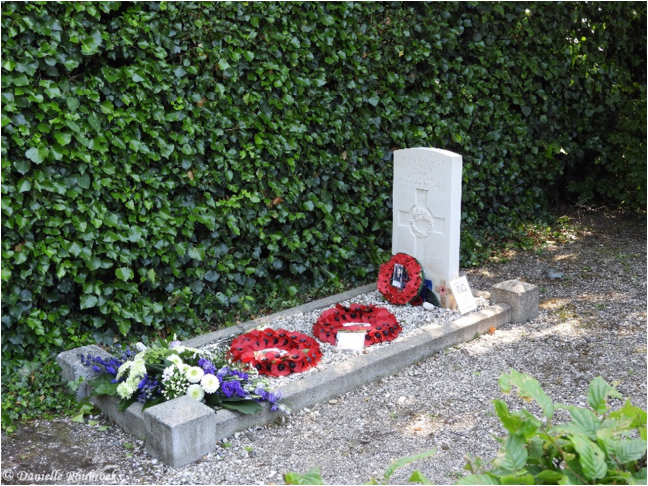 WO George Roney took off at 15.00 on 6th October 1944 as part of a three Spitfire armed reconnaissance sortie. Good weather favoured the German air defence batteries and all three aircraft were shot down after encountering heavy flak. George went down with his Spitfire near the hamlet of Schoondjke, the plane burying itself metres deep into a muddy field. On 9th October 1944 his family received a “Missing on air operations” telegram. The aircraft was not found until 9th June 1948 and George was buried on 12 June in Schoondijke cemetery. His is the only Commonwealth War Grave and has been adopted by children from the local school.