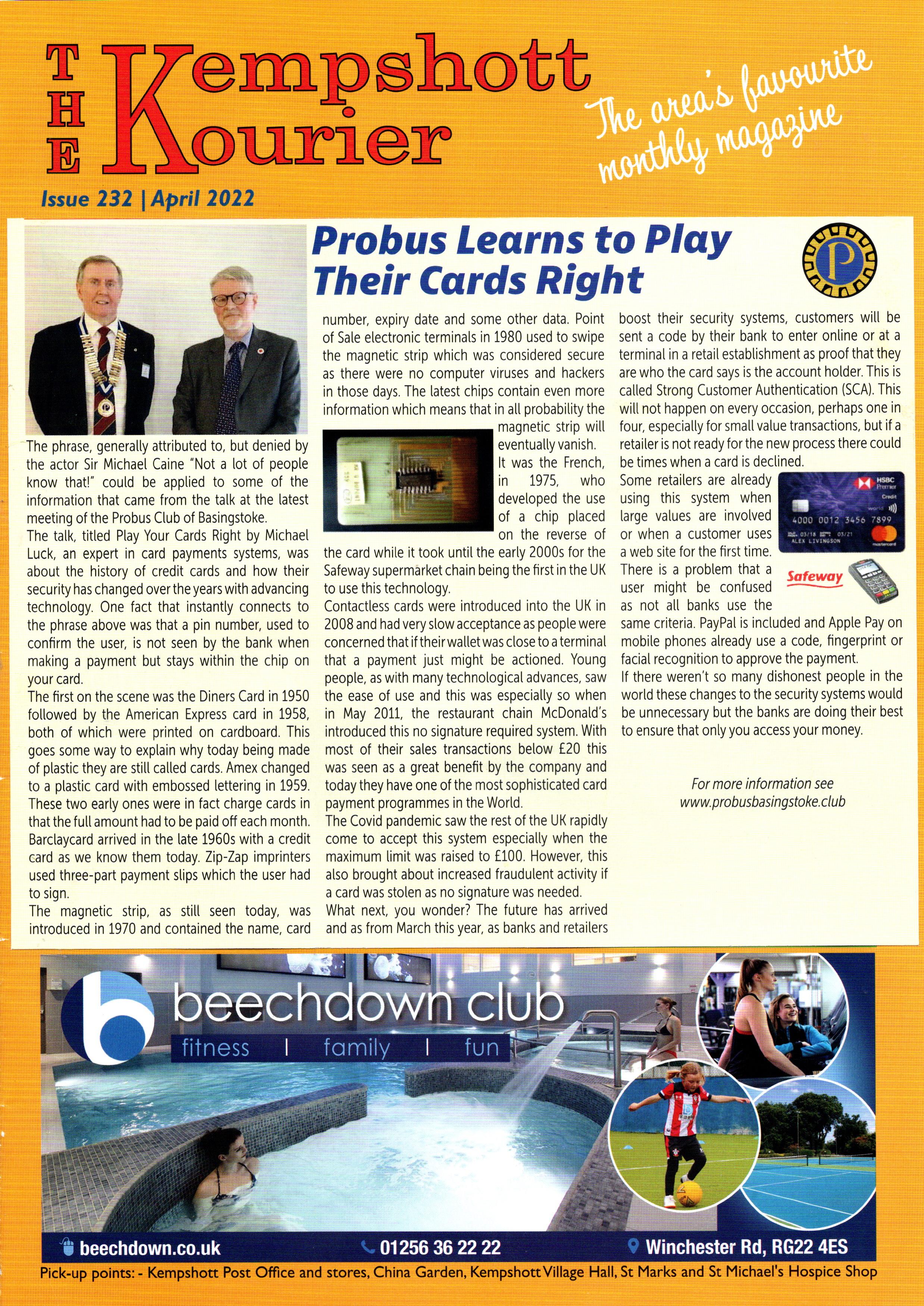 A good month for our publicity in the April local magazines. Except for the Link (Oakley) not featuring our report, the remainder carried the report on the talk given by our new member, Michael Luck, about credit cards. Clearly a timely piece in view of the latest security activities by the banks to ensure that only the named card holder has access to their funds.
