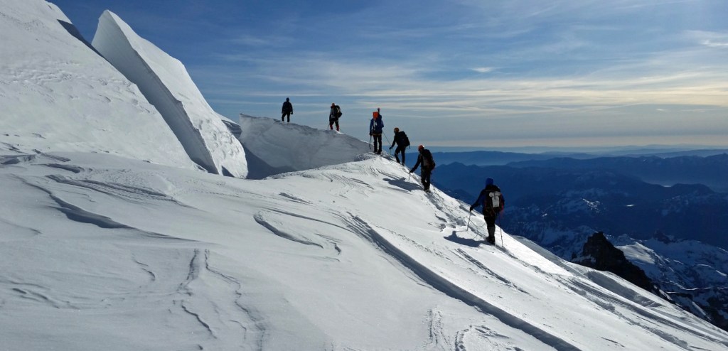Chris Perkins (in red beany hat) ascending Mt Ranier