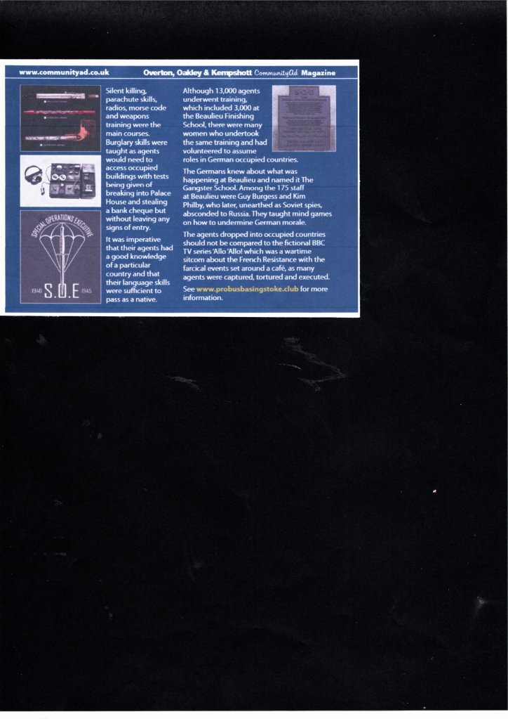 You will see that the Kempshott Kourier, continuing to be two weeks late, is their May edition where they gave a good deal of space for the S.O.E. training at Beaulieu. Likewise, the CommunityAd magazine for Overton, Oakley & Kempshott being behind our schedule also gave good coverage to the Beaulieu report.