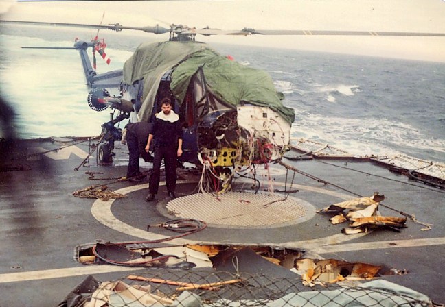 HMS Broadsword had a narrow escape from following the fate of HMS Coventry as a 1000lb bomb travelling at 450 mph hit the ship towards the stern, 10 feet above water level, travelled through two decks and emerged upwards through the flight deck, where it took off the nose of a Lynx helicopter, and bounced overboard, failing to explode.