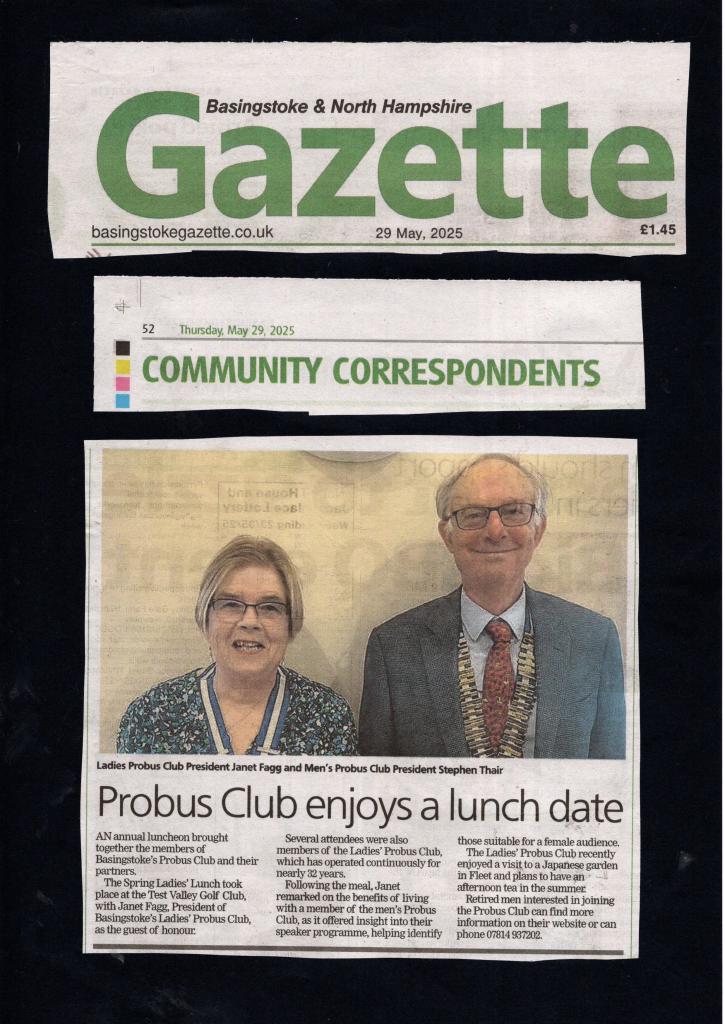 Probus members attending were Stephen Thair, Paul Flint & Janet Fagg, Michael & Pam Luck, Alex & Sarah Marianos, Ian & Sandra Nicholson, Chris Perkins, Geoff & Elizabeth Twine, Nick Waring, and Richard Wood.