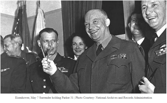 With eight patents and a lifetime guarantee, it became a symbol of innovation. Its fame was sealed when General Eisenhower held up two Parker 51s in a victory gesture after signing the documents that ended the Second World War.