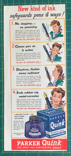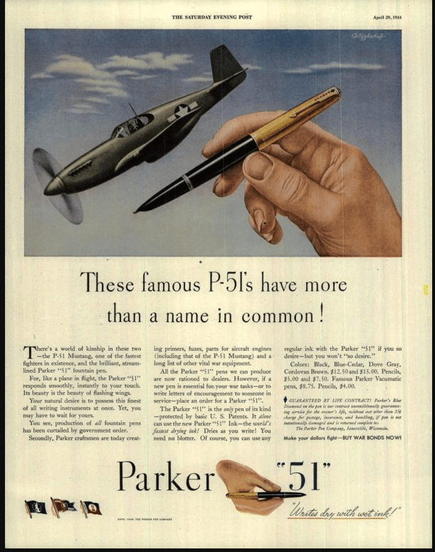 In 1921, the American company Parker launched the now-iconic Duofold and later solved the problem of slow-drying ink with the introduction of Quink-quick drying and fountain pen friendly. Parker’s advertising dominated in the 1930s, and in 1941 the company unveiled the “Parker 51” named to mark the firm’s 51st anniversary and to signal that the pen was a decade ahead of its rivals.