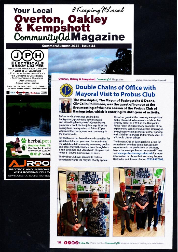 Consequently the only publications that carried anything about our Probus Club were the Kempshott Kourier and the CommunityAd magazine for Overton. Oakley & Kempshott with their Summer/Autumn Issue 44. Both these publications carried our earlier report about the visit of the mayor to our July meeting.